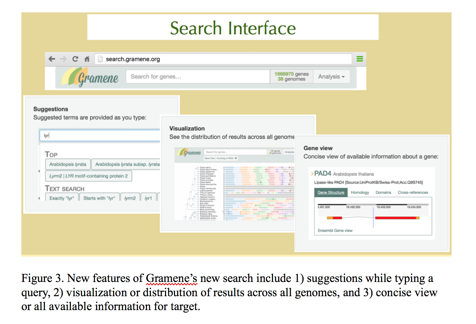 The Gramene project provides online reference resources for plant genomes and curated pathways to aid functional genomics research in crops and model plant species. Our website, www.gramene.org, facilitates studies of gene function by combining plant genome and pathway annotation with experimental data and cross-species comparisons. In other words, the data and tools in Gramene enable plant researchers to use knowledge about gene function in one species to predict gene function in other species. This ability should advance our fundamental understanding of plant physiology, including economically important traits such as hybrid vigor, grain development, seed dormancy, flowering time, drought tolerance, and resistance to diseases. Last year we significantly streamlined the user interface and backend functions.