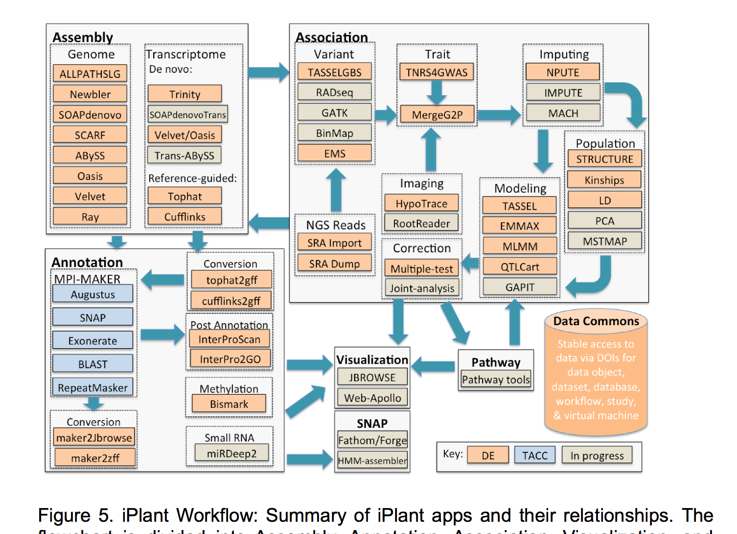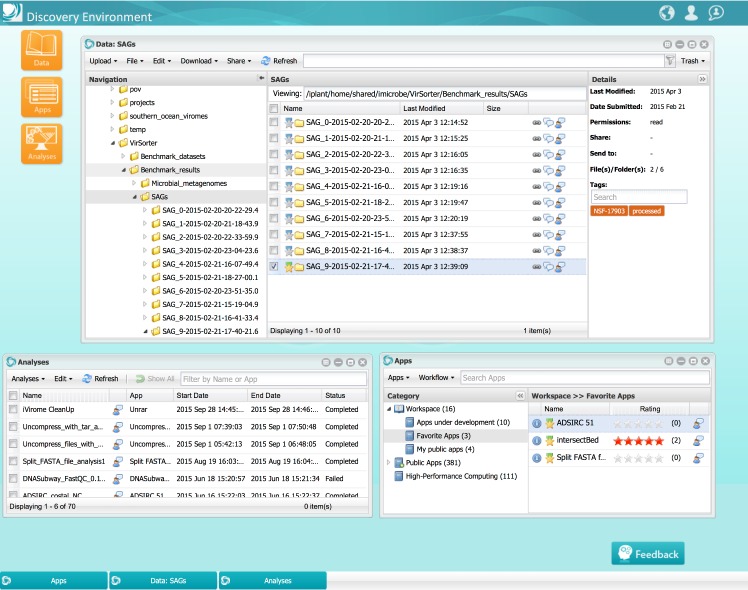 Having completed its first 7-year grant, the CyVerse Collaborative has made extensive progress toward meeting these goals. Work in the last year culminated in the development of multiple platforms that are now being used by the research and educational communities. Staff at CSHL contributed directly to some of these cyberinfrastructure platforms, or built upon existing platforms to provide scientists and educators with ready access to needed software and analysis tools. Within the Ware lab, these platforms include the CyVerse Data Store, Discovery Environment (DE), and Atmosphere. In addition, Ware lab has successfully built the first federated CyVerse system at CSHL that supports a dozen HPC apps running on a local cluster and storage system.